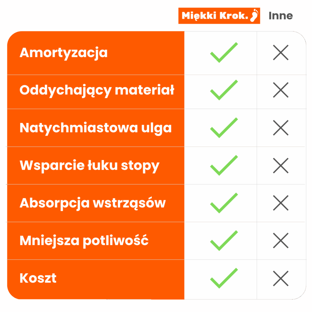 Miękki Krok wyrównuje ułożenie stopy, poprawia stabilność kostki i odciąża stawy, dbając o zdrową postawę przy każdym kroku.